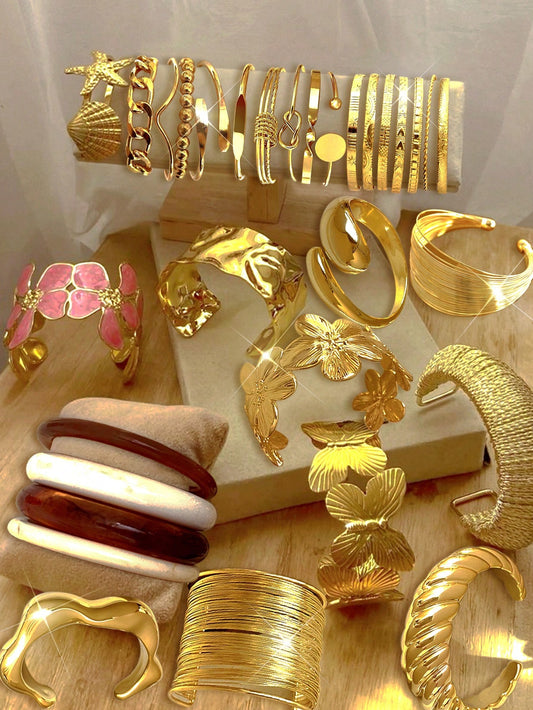 20/15/10/3 Pcs Set Chunky, Vintage, Elegant Geometric Teardrop, Flower, Butterfly Textured Ribbon, Chain, Cubanlink, Resin Embossed Texture Heart Chain, Twist Bead, Smooth Plain Bangle Bracelet Multi-Element Fashion Minimalist Elegant Sophisticated Retro