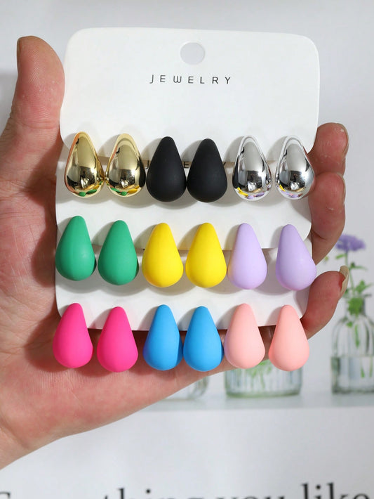 6PCS Fashion Smooth Water Drop Tear Shaped Earrings, Earrings, And Pendants Set In Gold, Silver, And Black, Suitable For Women's Daily Wear (No Cardboard Packaging)
