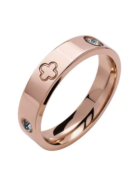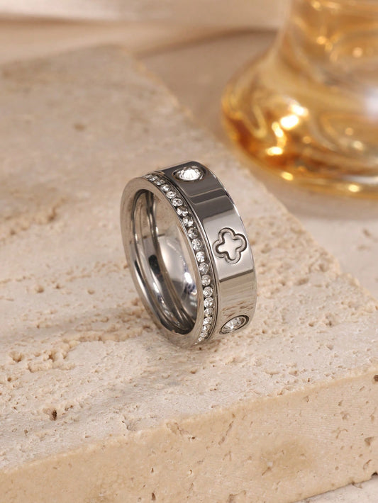 1pc Luxury Stainless Steel Lucky Clover Couple Ring, Sparkling Crystal Embellished, Fine Jewelry For Lovers Everyday Wear