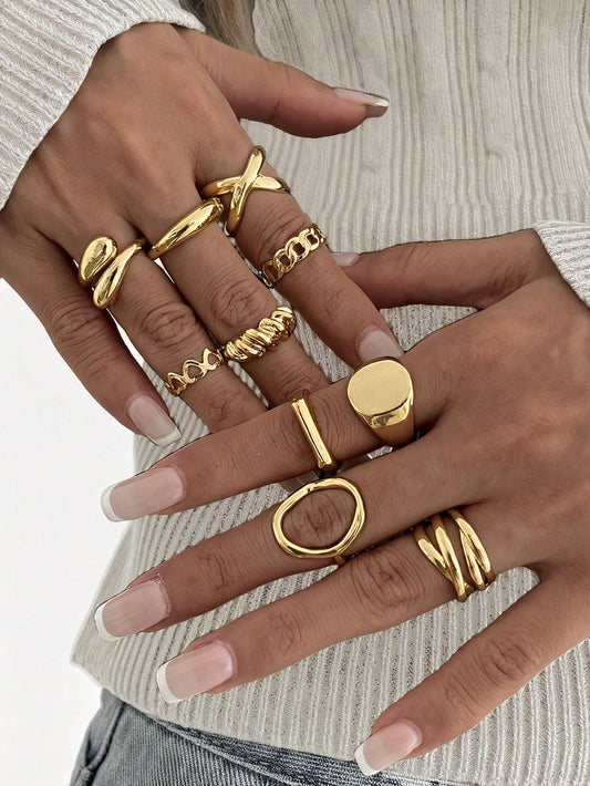10pcs Simple Metal Geometric Wide Chunky Jewelry Rings Set, Vintage Style Rings For Women, Suitable For Holiday, Beach, Date, Daily Casual Wear, Party